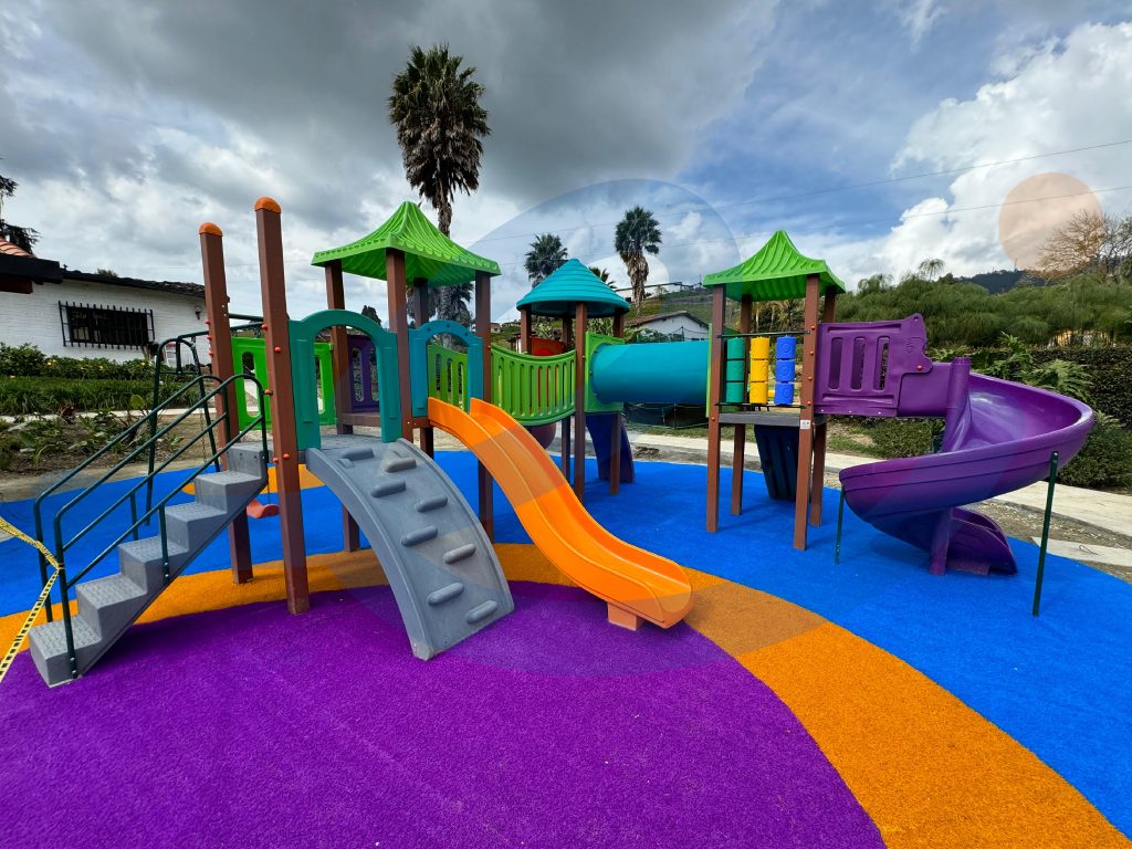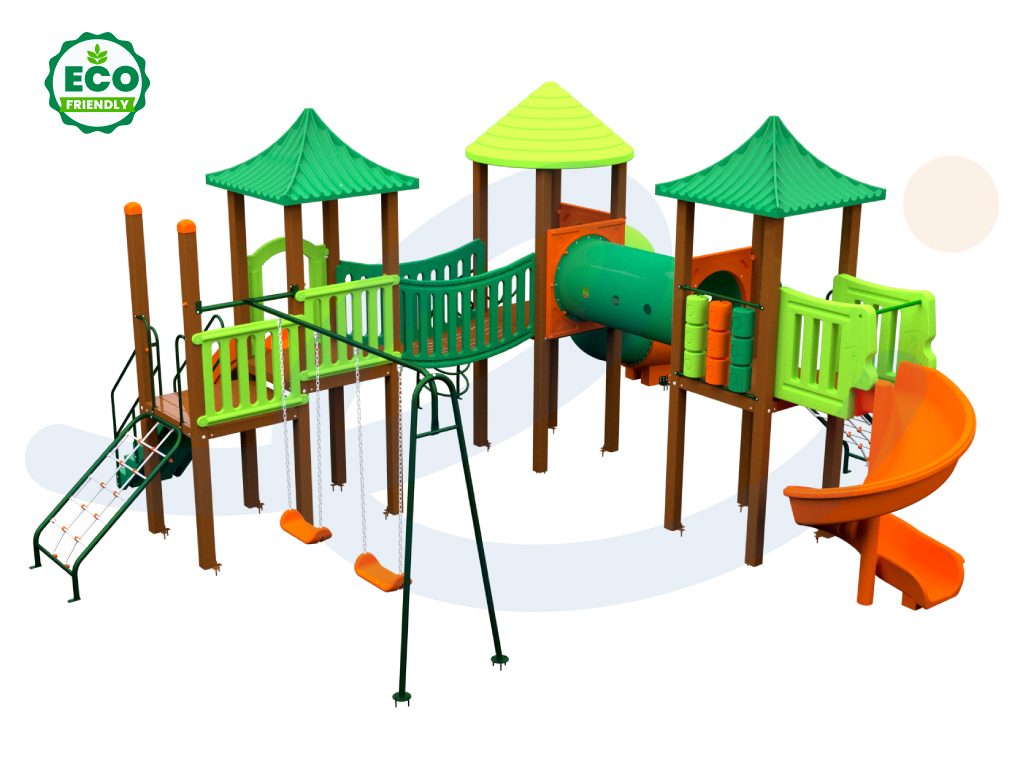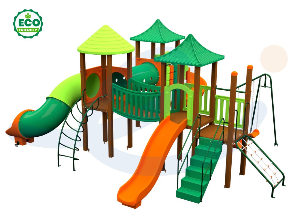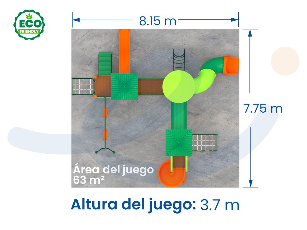 Este parque infantil está diseñado con madera plástica estructural ecológica 100% reciclada, plástico rotomoldeado reciclable (PELBD) con aditivos de protección UV y estructuras de acero galvanizadas con pintura electrostática libre de plomo.